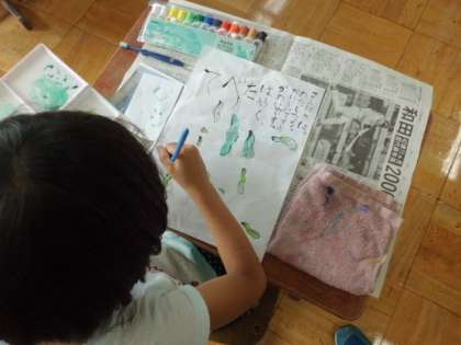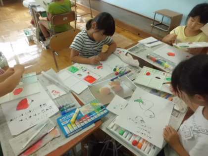 前回わりばしペンで描いた野菜の絵に絵の具で色をつけました。初めて細い方の筆を使い,丁寧に色をつけていきました。野菜にピッタリの色になるように,2〜3色の絵の具を混ぜ合わせました。どの野菜もとってもおいしそうに描けました。