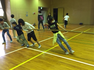 あいにくの雨ですが,館内でも元気に身体を動かしています。綱引き,インディアカ,フライングディスク,卓球,みんな楽しそうです。フライングディスクではディスクの投げ方を工夫して思わぬ方向に行ったり,綱引きでは綱に乗って引きずられたり…,新しい遊び方も開発しているようです。