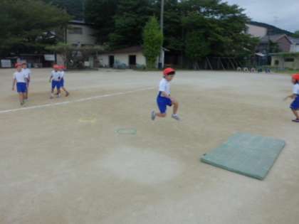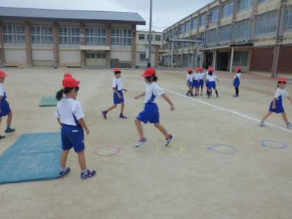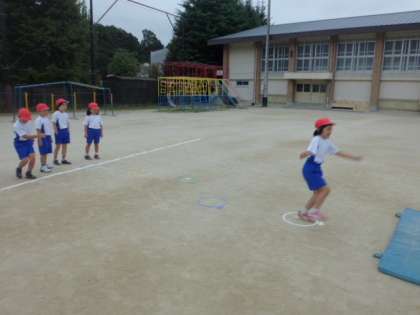 今日のとびくらべでは,輪っかを飛び石に,マットを島に見立てて,落ちないように跳んで進むことに挑戦しました。だんだんマットを遠くしていくのが楽しい様子でした。とびくらべの学習もあと1時間。これまで取り組んだ色々な跳び方に,もう一度挑戦したいと思います。