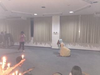楽しみにしていたキャンドルファイヤーの出し物が始まりました。それぞれのグループの個性がキラキラ光っています。ニャンコシリーズだったり,ショートコントだったり,絵本をオリジナルに変えたものだったり,みんな大笑いしています。
