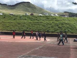 天気がよかったので,昼食までの間,広場で過ごすことにしました。元気いっぱい走り回っている子,亀山を見て『晴れた亀山にも登りたいなぁ』とつぶやいている子,望遠鏡を覗いて景色を楽しんでいる子,退所式の練習をしている子など,それぞれが思い思いに過ごしていました。