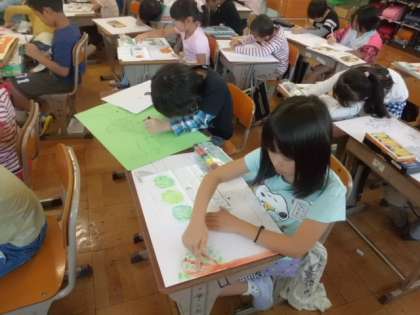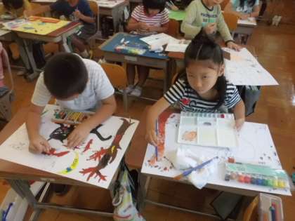 図工では,お話を聞いて想像したことを絵に表す学習をしています。ペン,絵の具,コンテ,クレヨンなどを使って色をつけます。同じ画材でも,ティッシュでこすったり,指でぬったり,スポンジでぬったりいろいろな工夫をしながら色をつけています。想像した世界にできるだけ近づけることができるようにがんばっていました。