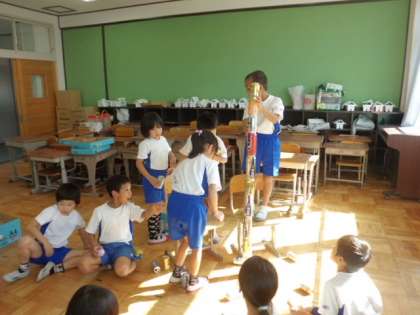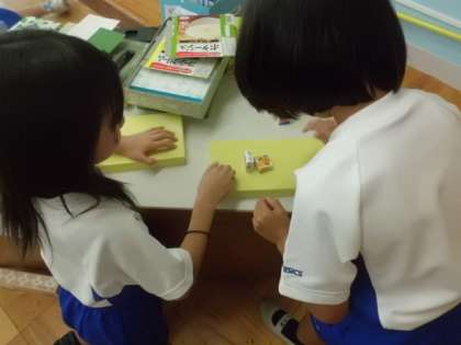 前回の生活科の時間にみんながおうちから持ち寄った材料を仕分けしました。今回は,それをつかってどのような遊びができるかいろいろ試しながら考えました。「転がす」「投げる」「積む」「並べる」などたくさんの遊び方を見つけ,楽しんでいました。