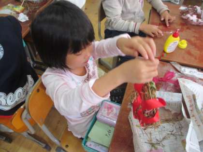 アサガオのつるで作ったリースに,飾り付けをしました。