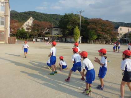リレーあそびも今日で最後。バトンパスもずいぶん上手になりました。最後のお楽しみで,赤白青組の三つの組に分かれてリレーをしました。白熱したレースにみんな大興奮で応援していました。