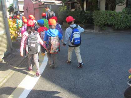 2年生のお兄さん,お姉さんに手をつないでもらい,バス停へ向かいます。
