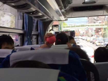 只今,バス内で爆弾ゲームをして盛り上がっています。