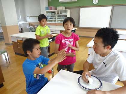 たんぽぽ学級では,7月に行われる宿泊学習に向けて,自分たちで朝ご飯を作ります。朝ごはんのメニューは何がいいか子どもたちに希望を聞くと,「おにぎり!」と。さっそくおにぎり作りを始めました。写真は,先生がおにぎりを作っている様子を真剣に見ているところです。できあがったおにぎりを先生が食べると,「わたしも作って食べたい!」と意欲満々です。