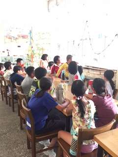キャンプファイヤーに向けて、レクリエーション係の打ち合わせ中です。