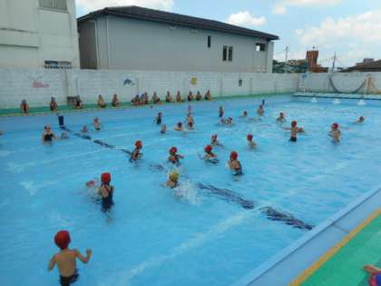 今日の水遊びでは,顔をつける,浮く,泳ぐの