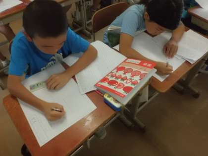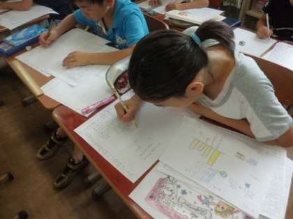 アンケートを取ったり,本やパンフレットで調べたりして取材を進めていた新聞づくりも,いよいよ清書をすることになりました。絵や図を入れたり,色をつけたりして,丁寧に仕上げています。