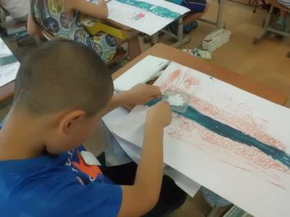 「郷土を絵にする」の絵に色をつける時に,これまでに学習したスパッタリングやタンポなど様々な技法を使って表現しています。どうしたら自分の思いにより近くなるのかを考えて工夫しています。