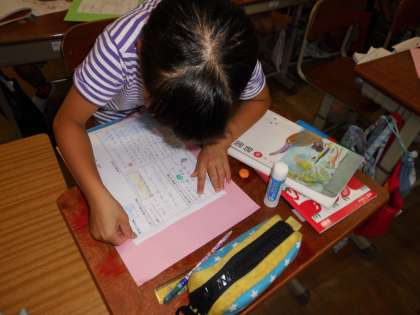 季節の言葉についての学習をしました。「春」の時と同じ形式のワークシートにまとめます。2回目なので,みんなのりのりで書くことができました。教室前の廊下に掲示していますので,是非ご覧ください。