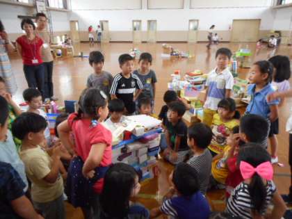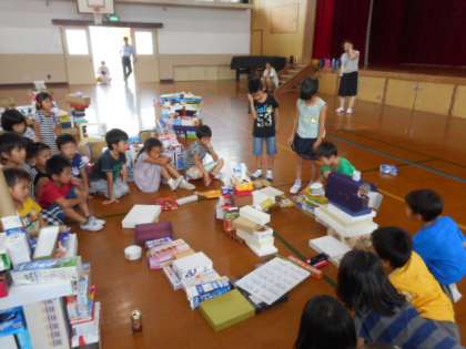 「恐竜の口が,箱が開けられるようになっています。」など,自分たちが工夫したところや頑張ったところを発表しました。