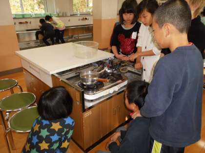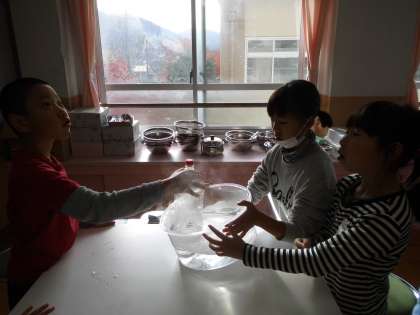 今日の理科の学習は家庭科室での学習です。なぜ家庭科室なのかというと…それは,お湯が大量に必要だからです。ペットボトルに栓をしたものをお湯につけたらどうなるかという実験をしました。さて,結果はどうだったのでしょうか。
