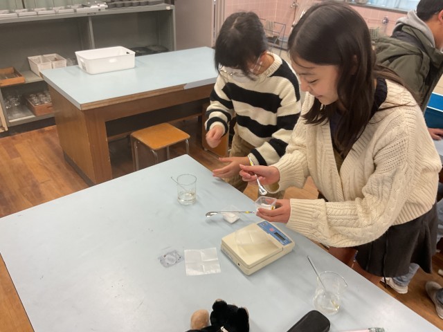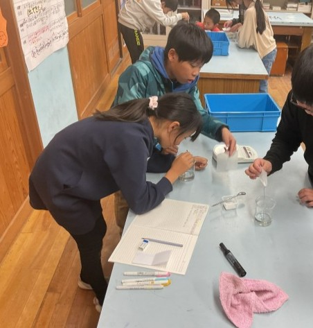 理科では「もののとけ方」の単元の学習をしています。「とけ残った食塩やミョウバンを溶かすにはどうしたらいいのか」という学習問題について考えました。水の量を増やしたり水の温度を上げたりするといいのではないかという予想を実験を通して確かめました。