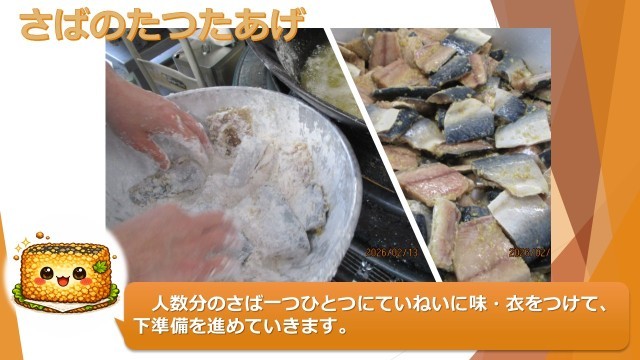 「さばのたつたあげ」は、人数分のさばに味をつけ、衣をつけ、一つひとつていねいに調理されていいます。最後は油でカラッと揚げられており、かじるとサクサクとした歯ごたえがたまりません。子どもたちもうれしそうにほお張っていました。