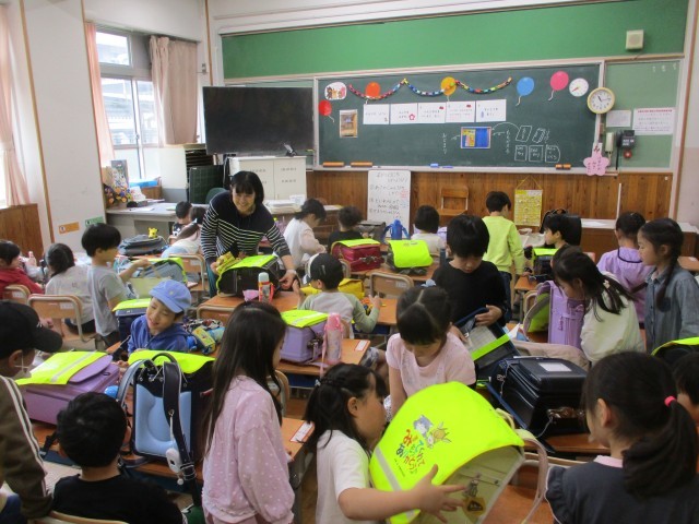 初日の教室の様子です。1年生のはじめの学習は帰る練習。自分で帰りの支度をして、集団下校で帰ります。集団下校は今週いっぱい続きます。保護者の皆様、途中までのお迎え、お世話になりますがよろしくお願いいたします。