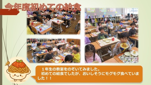 小学校生活初めての給食を食べる1年生の教室をのぞいてみました。何もかも初めてのことでしたが、先生のお話をよく聞いて、しっかり準備ができていました!