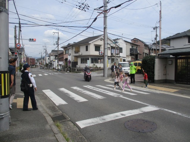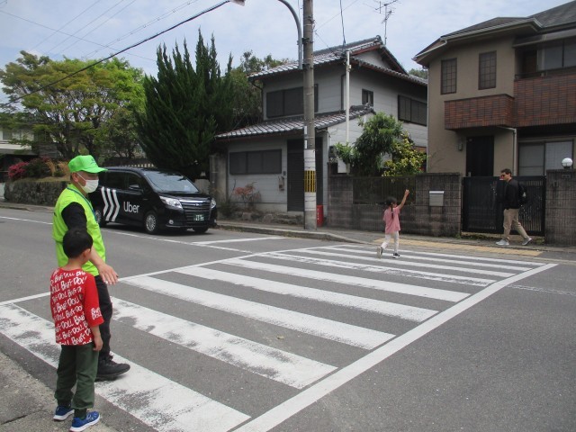 1年生が交通安全教室を行いました。学校の前の道路を使って、横断歩道を渡る練習、信号での安全確認などを行いました。歩くのは一人ずつ。みんな緊張した様子でしたが、左京警察署の方や地域の方に見守られて、安全に歩くことができました。
