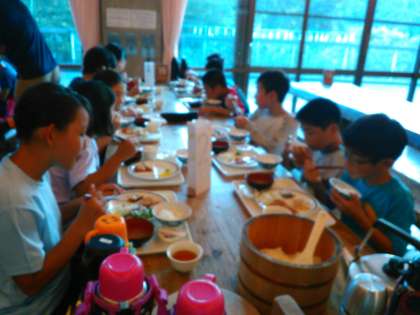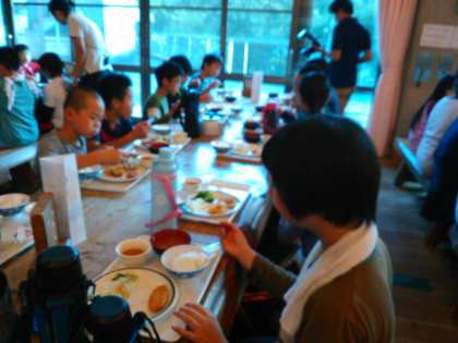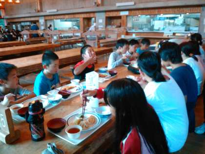 山の家の初めての食堂です。おかずは、バイキングです。よく活動したので、お腹すいたね。