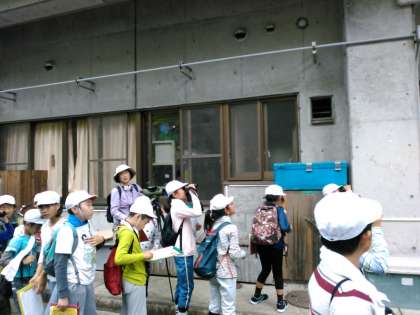自然観察の時間です。いつもお世話になっている先生に今回も教えていただきました。初めはツバメの観察です。ツバメの巣のなかに、可愛いヒナが3羽いました。双眼鏡を使って観察しました。