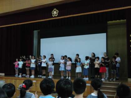 朝会で、今度の「吉田区民夏まつり」で発表する手話コーラスを全校で練習しました。