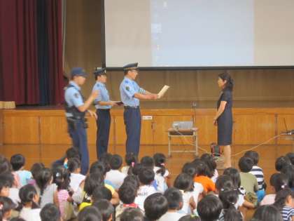 東一条交番の依頼を受け,5・6年生児童が特殊詐欺の標語をつくりました。そのお礼に川端署の方々がお見えになりました。まず,感謝状を受けお礼の言葉をいただきました。子どもたちも励みになったと思います。ありがとうございました。
