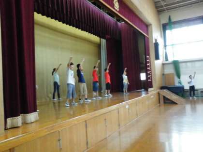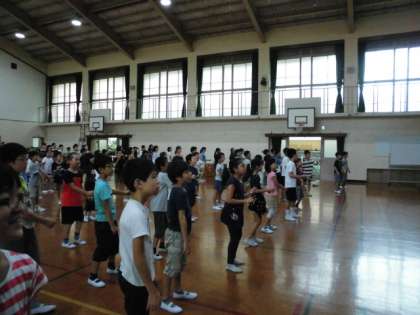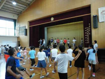 音楽に合わせて、リズムよく踊るダンス係に合わせて、子どもたちも元気に体を動かしていました。