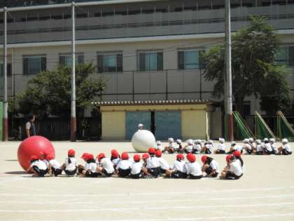 1年生は、大玉ころがしの練習をしていました。