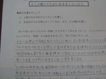 「ピチカートポルカ」では,1の面では,弦を指ではじいて,スタッカートの部分が多い,強弱の差が大きい,はねている感じで明るい曲,2の面では,かけっこで,応援されているような感じ,弾んでいて踊りだしそうな感じ・・・