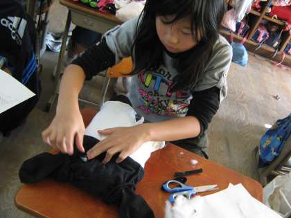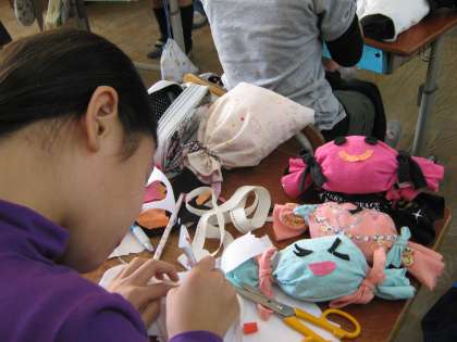 お家の不要な布や,ボタンなどいろいろな材料を用意して,自分の作品を作っていました。