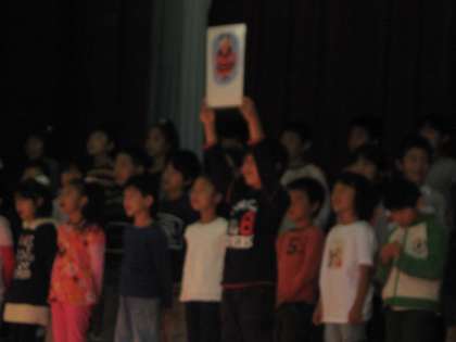 2年生の発表「うたで友だち」は,音楽の教科書に出てきた曲を中心に歌を歌いました。まず,2拍子の曲と3拍子の曲のそれぞれの楽しい感じの違いを表現しました。また,遊び歌では「ロンドン橋落ちた」と「BINGO」の曲を動きを交えながら発表しました。見ていた人にも笑顔で見てもらえたようでした。その後は,「1・2・3」をいろいろな国の言葉で言う歌を発表し,最後には会場いっぱいを使って「少年少女冒険隊」の」曲をがんばって歌いました。たくさんの拍手をもらってステージから降りる充実した表情が印象的でした。