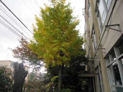 街路樹のイチョウは,葉っぱが落ちそうになると人の手が入って冬支度を終えていきますが,学校のは,自然のままです。一条通り沿いのイチョウは,黄色くなっています。銀杏はできないほうのタイプです。川端通り沿いに少し前にたくさん銀杏が落ちていたようです。