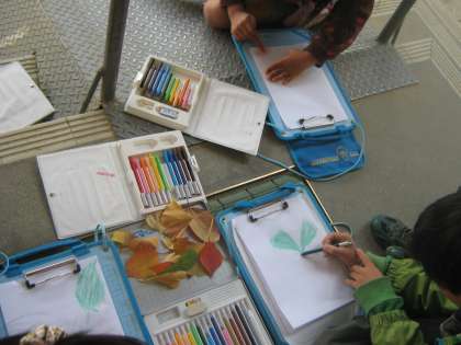木々の葉が色づき秋の深まりを感じます。今日は,いろいろな落ち葉のかたちを紙にうつしとる技法〜フロッタージュ〜を楽しみました。