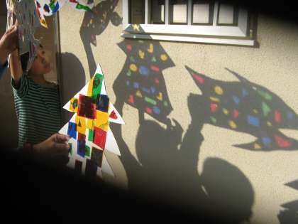 ・・・などに気付いた後で,自分の思いを広げて作品作りをしました。今日は作ったものを持って外に出て,いろいろな場所に映して,その美しさを楽しみました。近づけたり遠ざけたりすると光と影が変化して,その面白さにしばらく見入っていました。