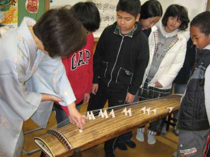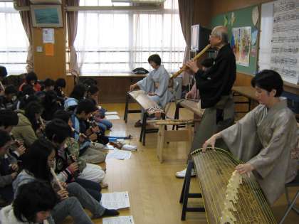 尺八はなかなか音がでず,苦戦していましたが,息の出し方のコツをつかむと,尺八特有の低い響きのある音色を響かせていました。