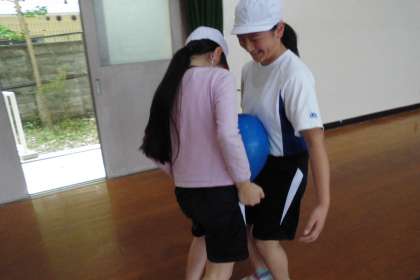 体育科の「体ほぐし運動」では,円になって人間椅子をつくったり,風船や新聞を使って,落とさないように走ってリレーをしたりしました。