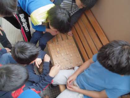 ルールを教えあいながら,仲よく将棋をしている子どもたち。早くルールを覚えられるといいね!