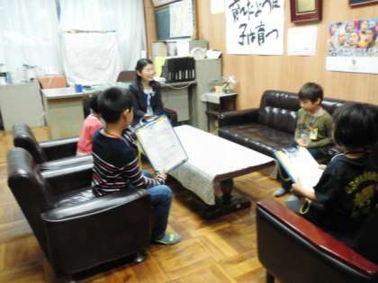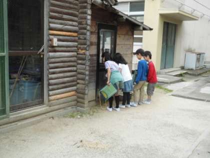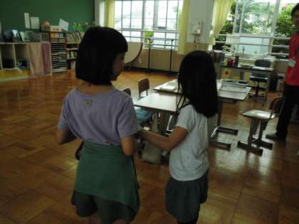 今日は,学校の中を探検しました。「大きいお兄さんが,勉強をしていました。」「校長室には,大きないすがありました。」「2年生の部屋にはザリガニがいたよ。」などたくさんの発見をしました。優しい2年生に案内してもらってにこにこ笑顔の1年生でした。