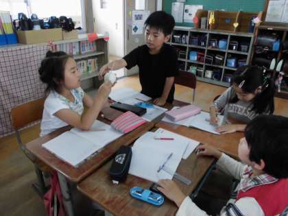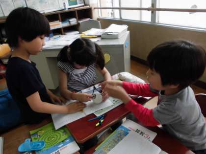 手を使ったりコンパスを使ったり2年生での学習を思い出したり・・・班のみんなで頭を突き合わせ,知恵をしぼり,活発な話し合いが行われていました。