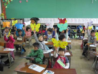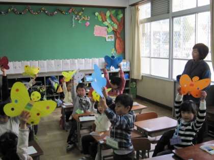 きれいなバタフライを完成させて、自分の蝶について話して、その後のバタフライの記念写真です。楽しくコミュニケーションしていました。