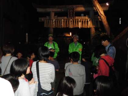 真っ暗なところをチカチカと光るもの。それがホタルです。光の筋がたくさん見られます。ホタルが飛んでいるのです。捕まえて掌に載せている子もたくさんいました。