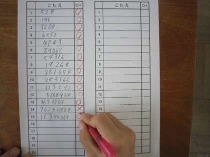 指導の先生が,一定の速さで「さん,はち,いち,ろく,ご,よん」と読み上げられます。すると,子どもたちは,それを聞いた後に,「381654」と書くのです。全部で15題出題されました。何と,最高14題正解する子どもがいました。