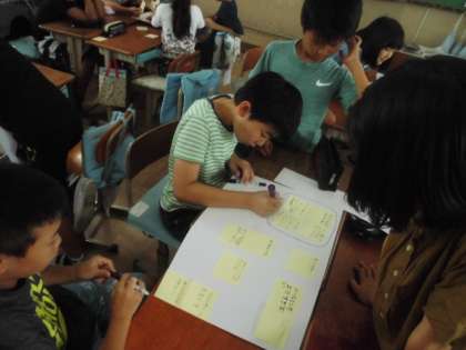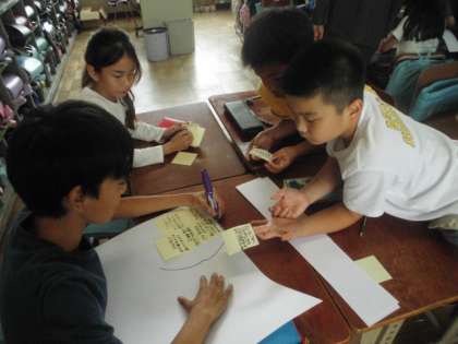 スマートフォンを使う時に気を付けることを,グループで出し合い,画用紙にまとめました。さらに,これから実践できる使い方をグループで2つ選び,発表しました。