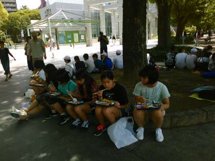 科学館の前の木陰で昼食のお弁当を食べました。天むす弁当です。お弁当の中身を写真に撮るのを忘れました。すみません。