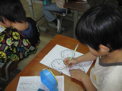 戸惑いながらも何回も何回も練習して早く自分たちで時計がよめるようになるよう頑張ります。