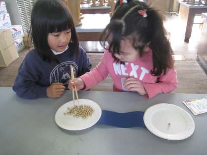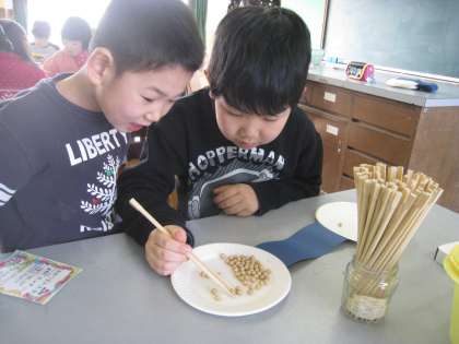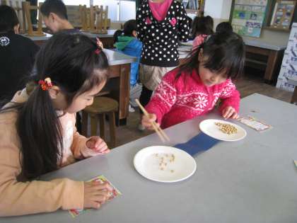 小さいお豆をつかむのはなかなか難しかったようですが,集中して上手にお箸を