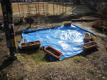 田んぼの跡に種をまきました。時期が遅れているので、ビニルシートをかけて保温しています。ビオトープの掃除当番が気持ちよく活動しました。