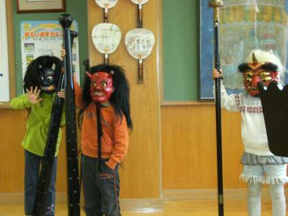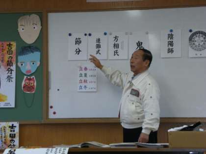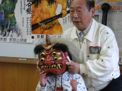 二年生は,生活科で地域のことについて学習しています。この吉田の町の伝統行事である節分祭を,二月二日に実際に見学に行きます。それにあたって,節分の意味や追儺式のこと,吉田神社の「赤オニ」「青オニ」「黄オニ」の違いや意味について,地域の方から教えていただきました。「赤オニ」は怒りを,「青オニ」は悲しみを,「黄オニ」は辛さを意味していることや,それを追い払う方相氏の役割などをわかりやすくお話していただき,子どもたちもとても興味をもったようでした。実際のお面をつけてもらった子もいて,貴重な経験ができました。